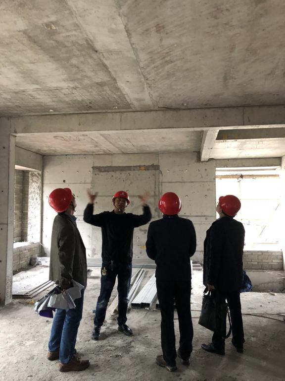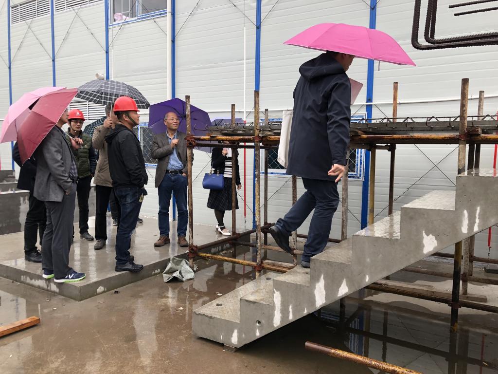 3月14日下午,做爱视频 15位专任教师前往常熟市辛庄镇巨匠集团碧桂园项目工地,参观学习装配式建筑施工现场,在巨匠集团张潮勇副总经理的带领下,冒雨倾听项目经理对装配模块的介绍,观看装配完成现场及装配流程,并在会议室进行了深入探讨和交流。