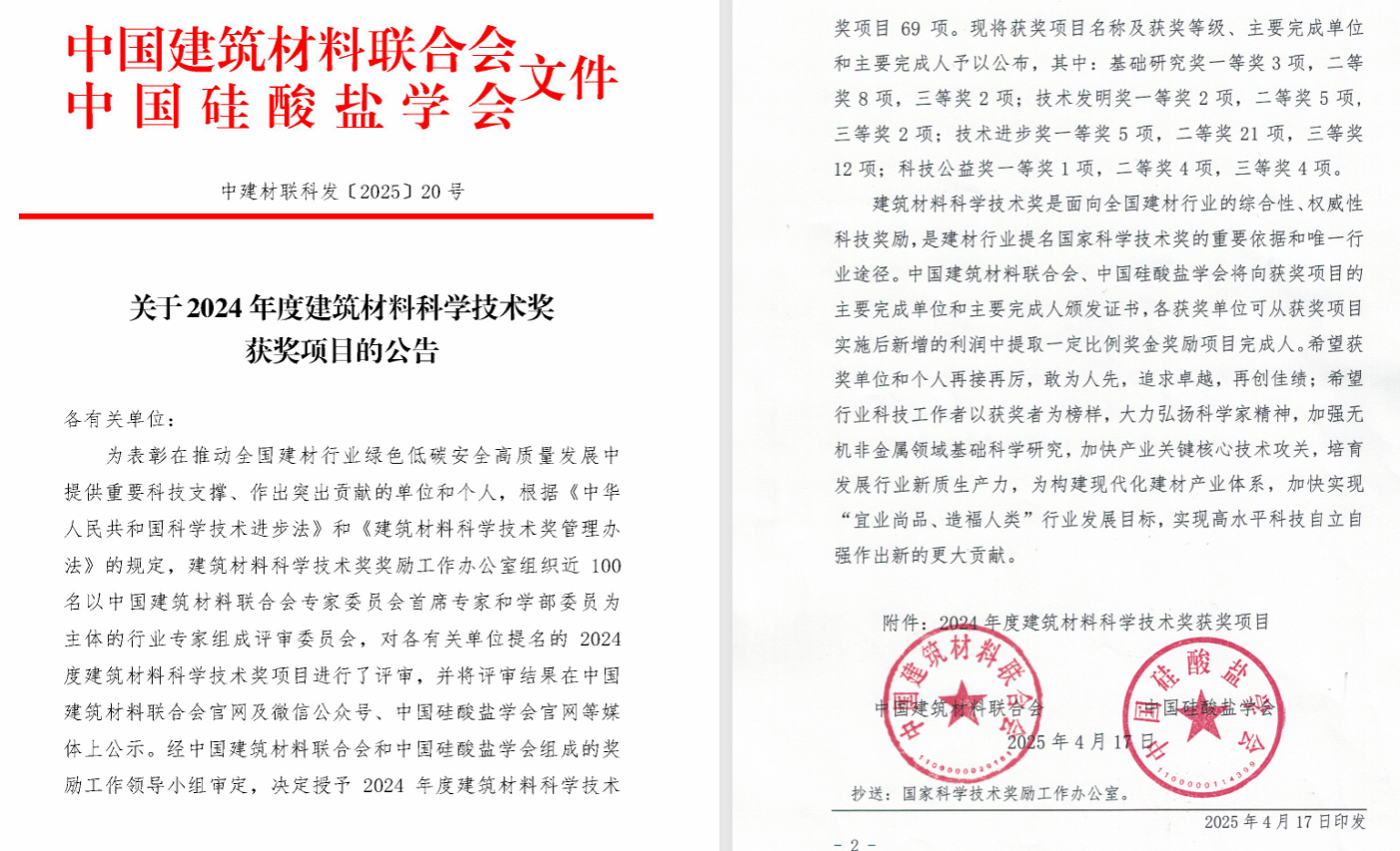 据悉,建筑材料科学技术奖是面向全国建材行业的综合性、权威性科技奖励(原建材工业部科技进步奖),是建材行业提名国家科技技术奖的重要依据和唯一行业途径,是国内建筑材料行业的最高科技奖项。