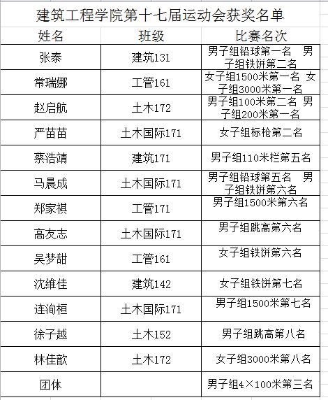 在第十七届校田径运动会上取得了综合排名第八的优异成绩。其中,常瑞娜同学分别获得女子1500m、3000m两项第一名;张泰同学获得男子铅球、男子铅球第一名、第二名;、赵启航同学分获男子200m、100m第一名和第二名;严苗苗获得女子标枪第二名等好成绩。
