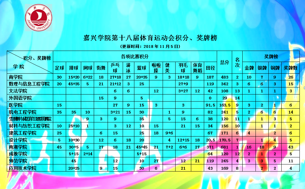 11月3日下午,由校体委、校工会主办、体军部承办的嘉兴学院第十八届体育运动会暨田径比赛闭幕式在越秀校区田径场举行,这也标志着自今年3月以来开始的第十八届体育运动会12个项目的比赛全部结束,全校14个分院参加了此次运动会。