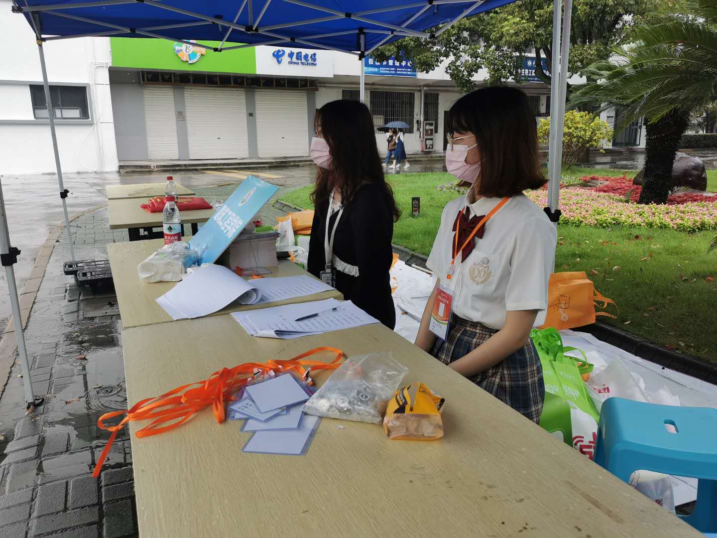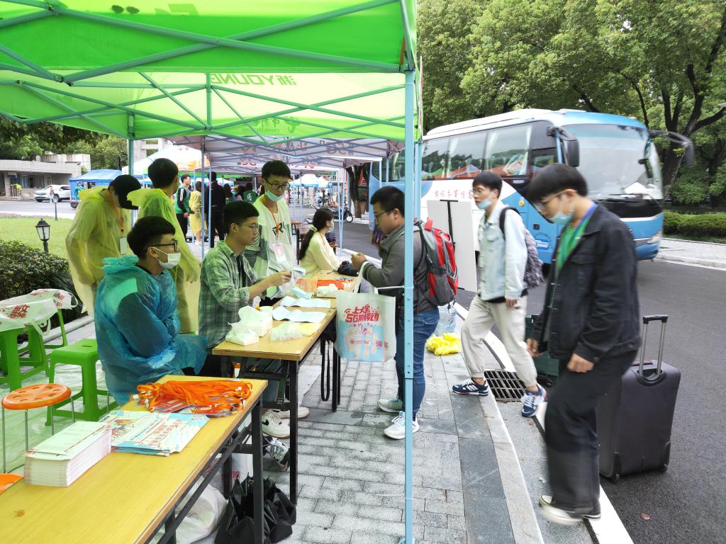 迎新站点完成报到。校园内中心广场的志愿者们面带微笑,积极为新生解答疑惑,并向其发放迎新手册、帆布袋、矿泉水等迎新礼。