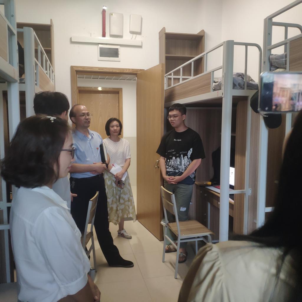 新生寝室,探望远道而来的新同学。学院党委副书记杨智慧、学工办辅导员陪同走访。