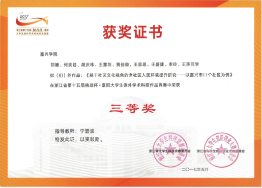 近日,由团省委、省教育厅、省社科院、省科协、省学联联合主办的浙江省第十五届“挑战杯·富阳”大学生课外学术科技作品竞赛决赛在浙江工业大学圆满落幕。做爱视频 宁碧波副教授指导的作品《基于社区文化视角的老社区人居环境提升研究——以嘉兴市11个社区为例》在决赛中荣获浙江省三等奖。
