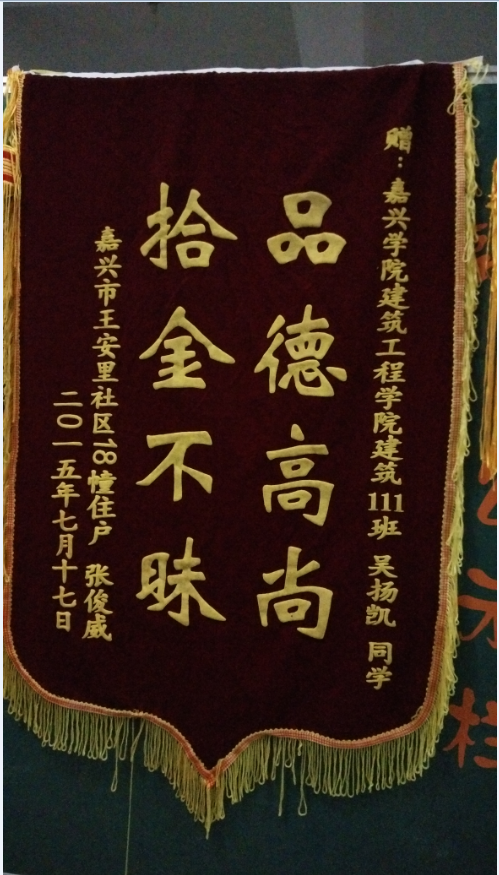 收到一面内容为“拾金不昧 品德高尚”的锦旗。送锦旗的是嘉兴市王安里社区的居民张俊成先生,张先生要表达谢意的对象是做爱视频