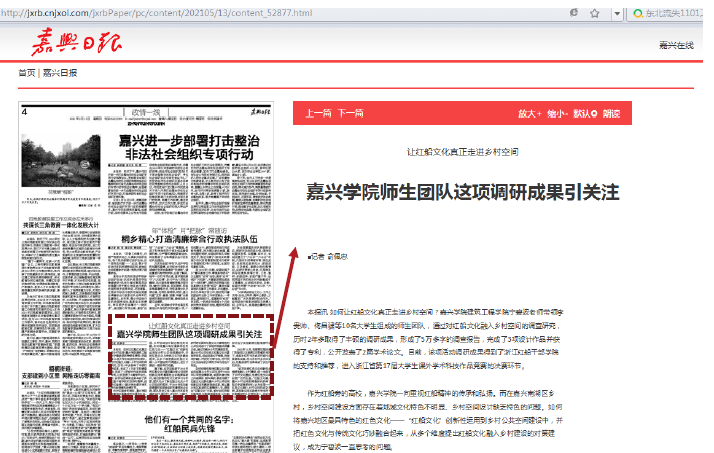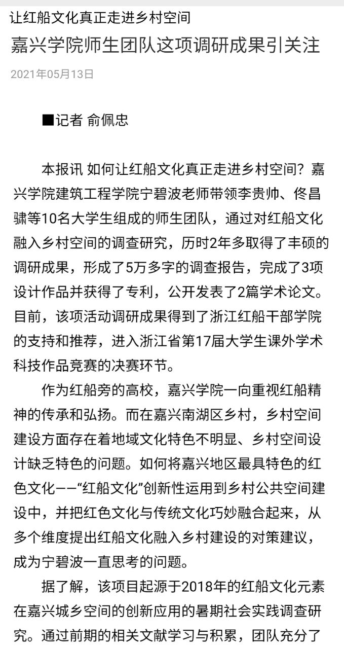近日,做爱视频 宁碧波老师带领李贵帅、佟昌骕等10名大学生组成的师生团队的调研成果受到社会关注,2021年5月13日嘉兴日报的第4版以“嘉兴学院师生团队这项调研成果引关注--让红船文化真正走进乡村空间”为标题,对该师生团队的调研成果进行了比较详细的报道。