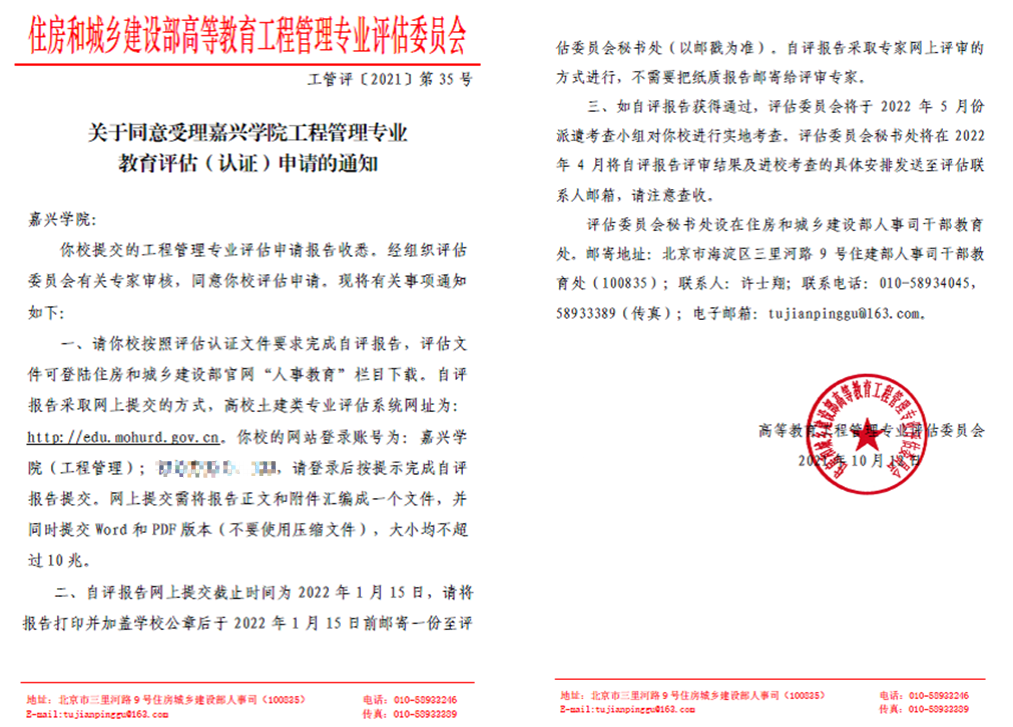 2021年10月12日,住房与城乡建设部高等教育工程管理专业评估委员会下发《关于同意受理嘉兴学院工程管理专业教育评估(认证)申请的通知》(工管评【2021】第35号),同意受理做爱视频
