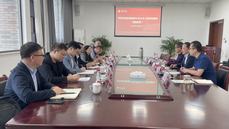 会上,姚民乐书记代表学院对马处长一行来访表示欢迎,并向大家介绍了建工学院的办学历史及发展现状,他指出,安徽建筑大学土木工程学院和嘉兴学院建工学院近几年建立了良好的交流基础,希望双方能够进一步加强合作交流,促进共同发展。马处长对建工学院的热情接待表示感谢,他简要介绍了安建大的基本情况及此次调研的目的,希望借此机会,借鉴嘉兴学院及建工学院在人才培养、教学管理、实验室建设等方面的经验和做法,以后能进一步加强交流互鉴、携手共促两校事业取得高质量发展。双方围绕党建工作、学科与专业建设、实验室建设、人才培养等展开了深入交流讨论。