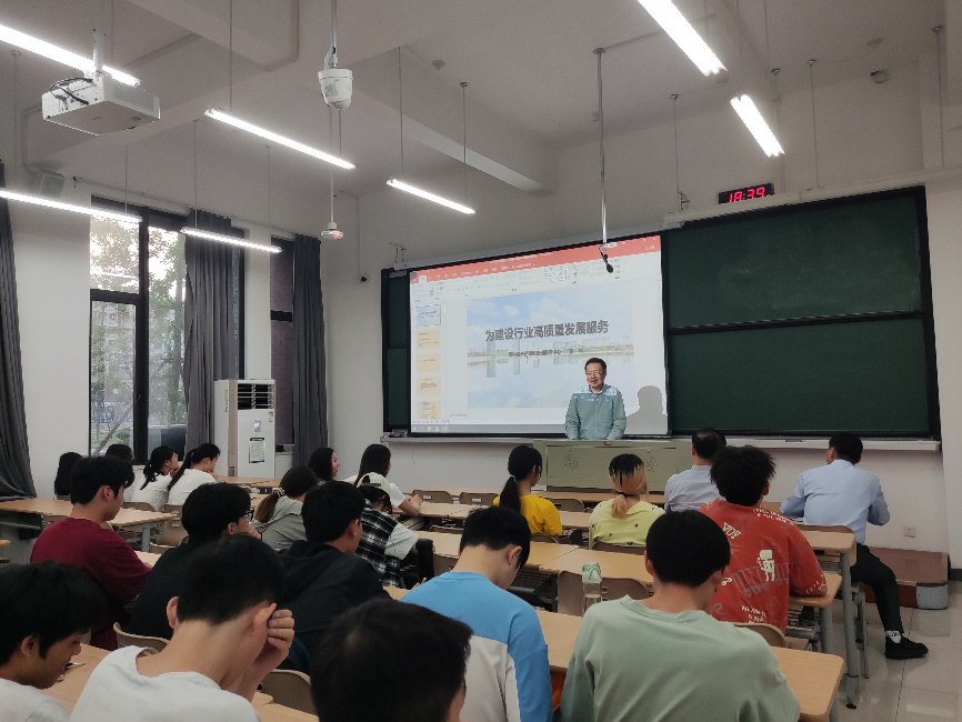 报告通过深入浅出的内容,从建设工程法律法规、招投标、工程质量管理以及创新、协调、绿色、开放、共享的发展理念等方面进行了生动的讲解,为师生们展现了建设行业的现状与未来的发展,分享了科学技术对建设行业的影响。