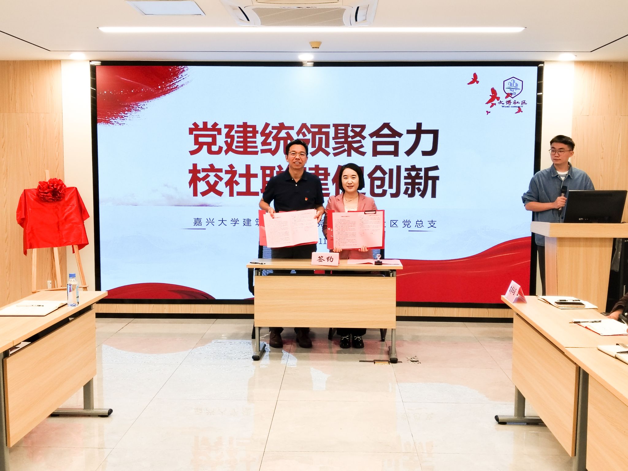 签约仪式在文博社区党群服务中心隆重举行。学院党委书记童勇军与文博社区党总支书记徐红霞共同签署了党建结对共建协议书。