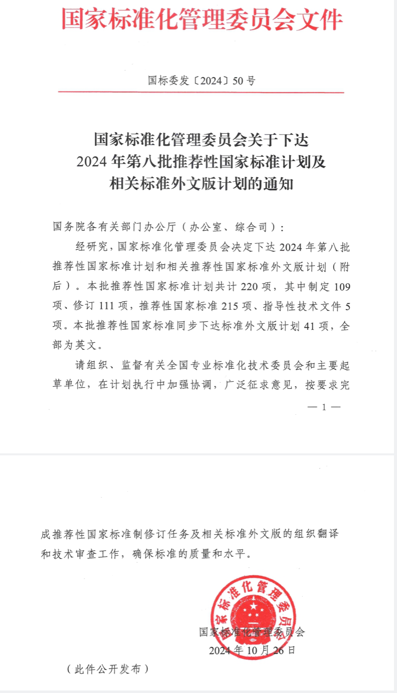 不久前,国家标准化管理委员会[2024]50号发出“关于下达2024年第八批推荐性国家标准计划及相关标准外文版计划的通知”,其中由做爱视频