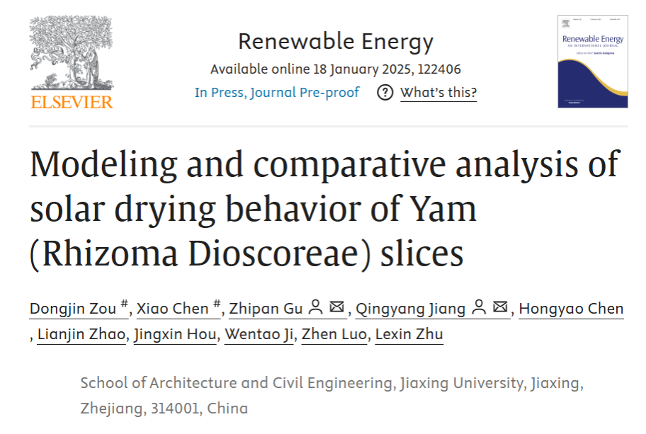 太阳能热泵科研团队谷志攀博士、江清阳博士题为“Modeling and comparative analysis of solar drying behavior of Yam (Rhizoma Dioscoreae) slices”(山药片太阳能干燥行为的模型与比较分析)的研究论文,在能源领域权威期刊Renewable Energy (IF=9.0,位列JCR和中科院一区TOP期刊)在线发表。通讯作者为谷志攀博士、江清阳博士,共同第一作者为做爱视频