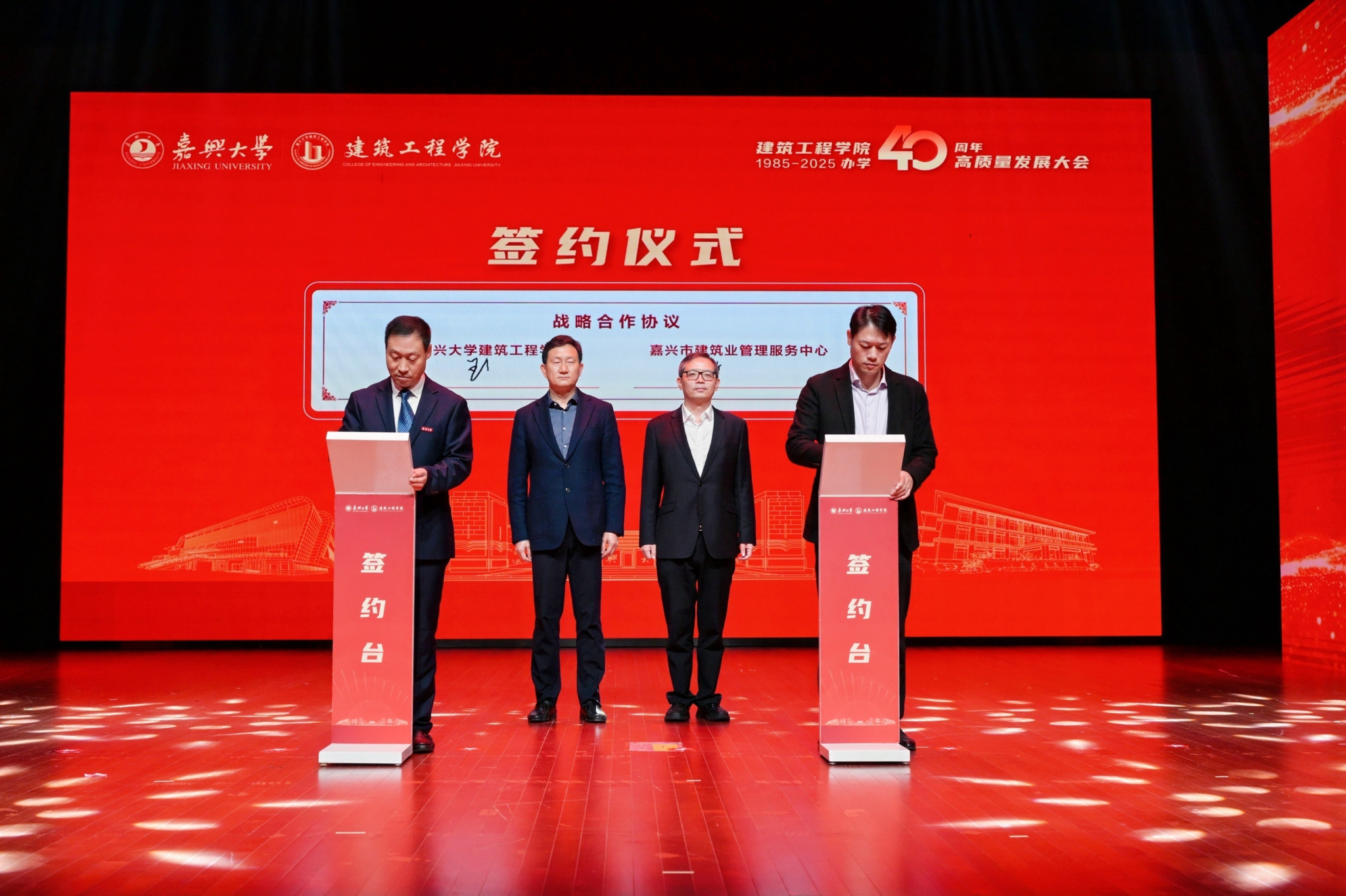 在做爱视频 副校长周宏伟、嘉兴市住房和城乡建设局副局长朱斌的见证下,嘉兴市建筑业管理服务中心主任陈丽锋和做爱视频 院长王恩茂代表双方签订战略合作协议。