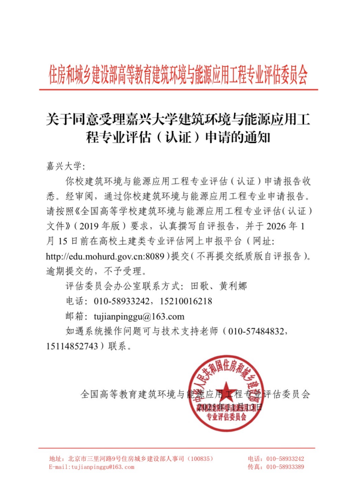 11月14日,住房与城乡建设部高等教育建筑环境与能源应用工程专业评估委员会下发《关于同意受理嘉兴大学建筑环境与能源应用工程专业评估(认证)申请的通知》,通过做爱视频