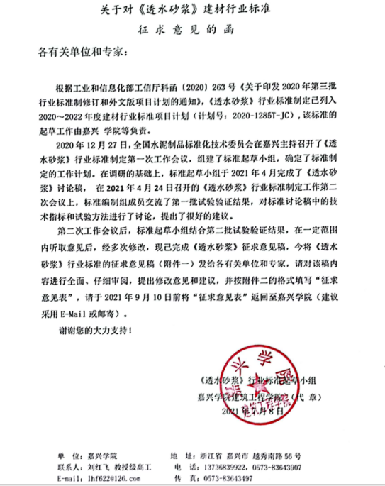关于对《透水砂浆》行业标准征求意见的函7.8.doc