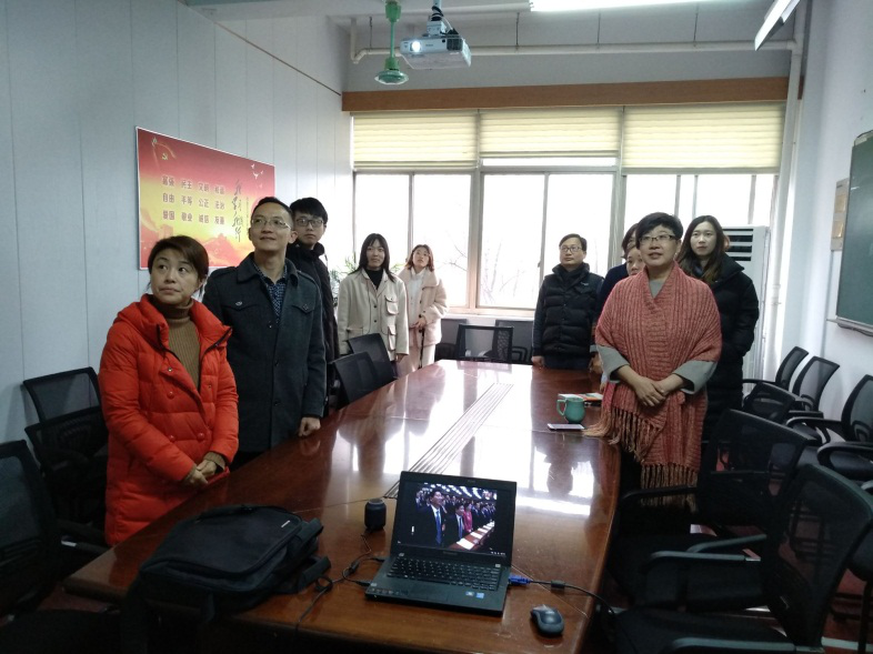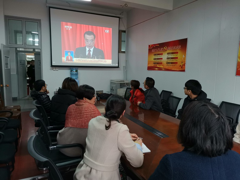 3月5日上午9:00,十三届全国人大二次会议在北京人民大会堂开幕。党委书记费锦红和十余位没课的师生在204会议室收看了此次大会的现场直播。