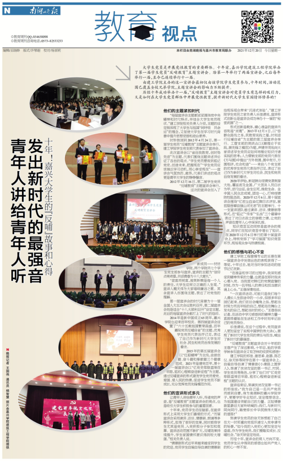 2021年12月20日,《南湖晚报》“教育视点”版,以“青年人讲给青年人听,发出新时代的最强音——十年!做爱视频