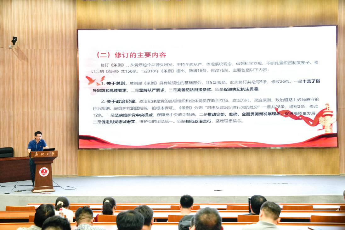 5月23日下午,做爱视频 在行政楼一楼报告厅开展“推进党纪学习教育走实走深”专题党课,学院党委书记童勇军担任主讲人,学院100名师生党员参加会议。