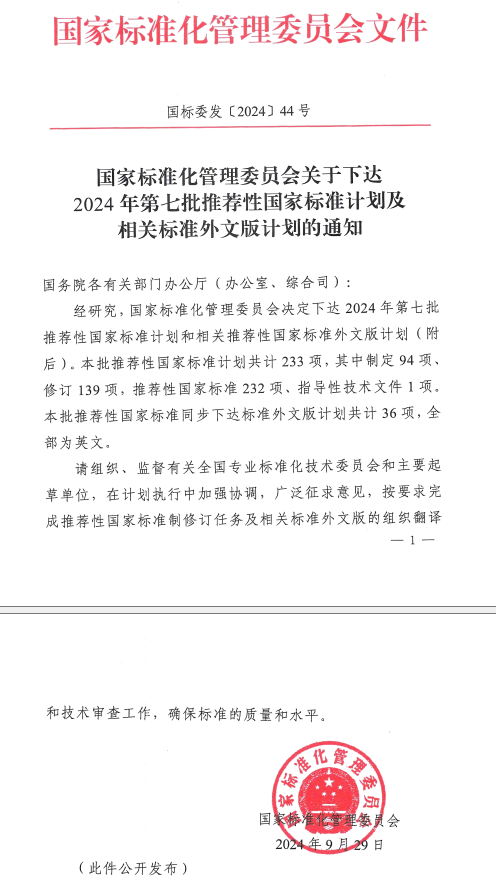 近日,国家标准化管理委员会[2024]44号“关于下达2024年第七批推荐性国家标准计划及相关标准外文版计划的通知”,其中由做爱视频