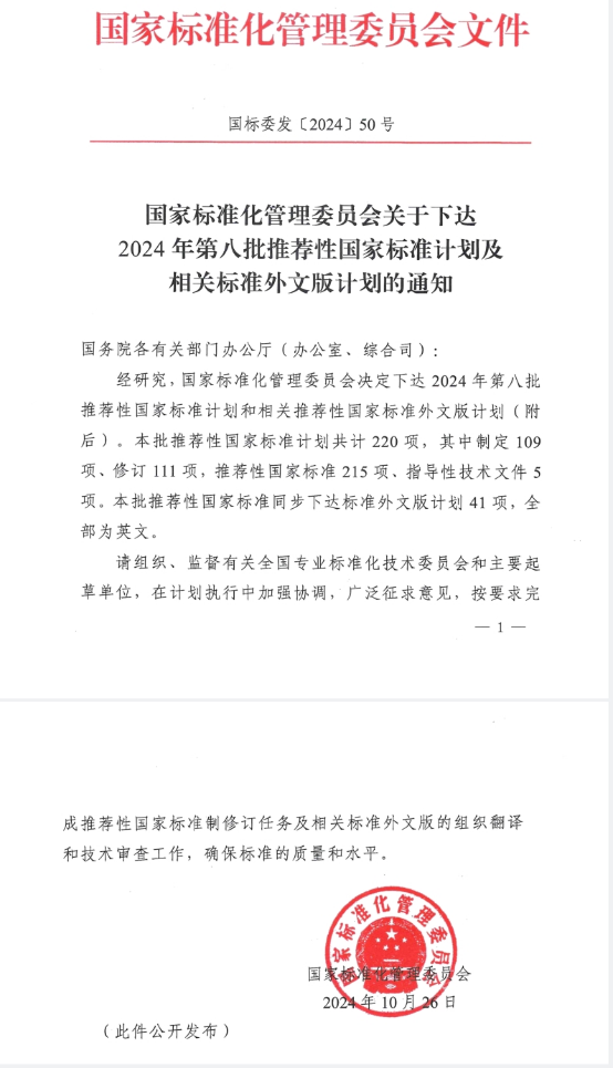 日前,国家标准化管理委员会[2024]50号发出“关于下达2024年第八批推荐性国家标准计划及相关标准外文版计划的通知”,其中由做爱视频