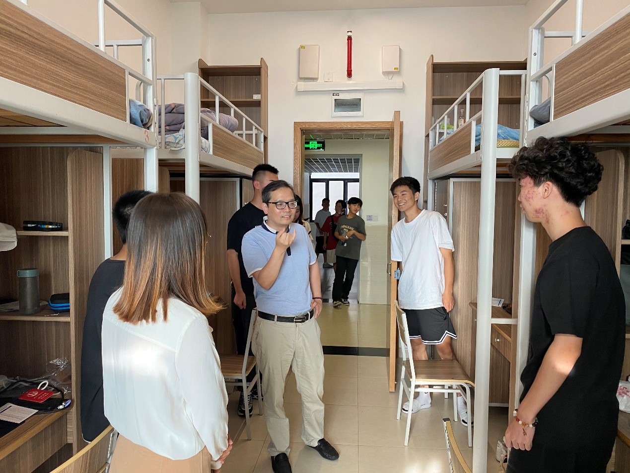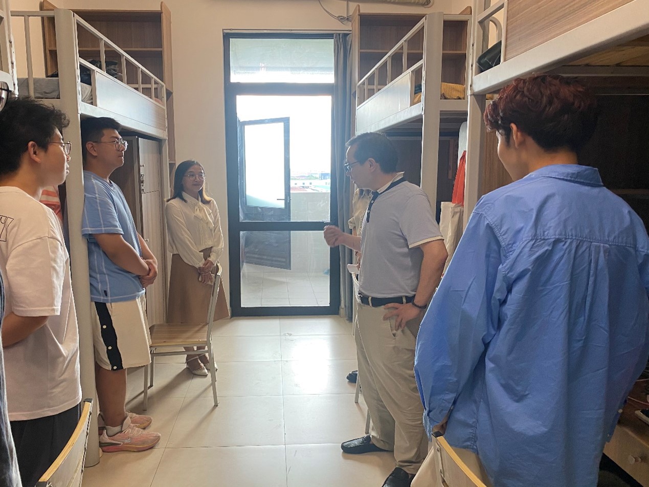在走访过程中,周校长细致地了解新生的基本情况,亲切地询问同学们的假期生活。周校长叮嘱同学们要尽快适应大学生活,以积极的态度、崭新的面貌投入到新学期的学习与生活中来,用知识武装自己,努力学习专业知识,不负宝贵的青春年华。