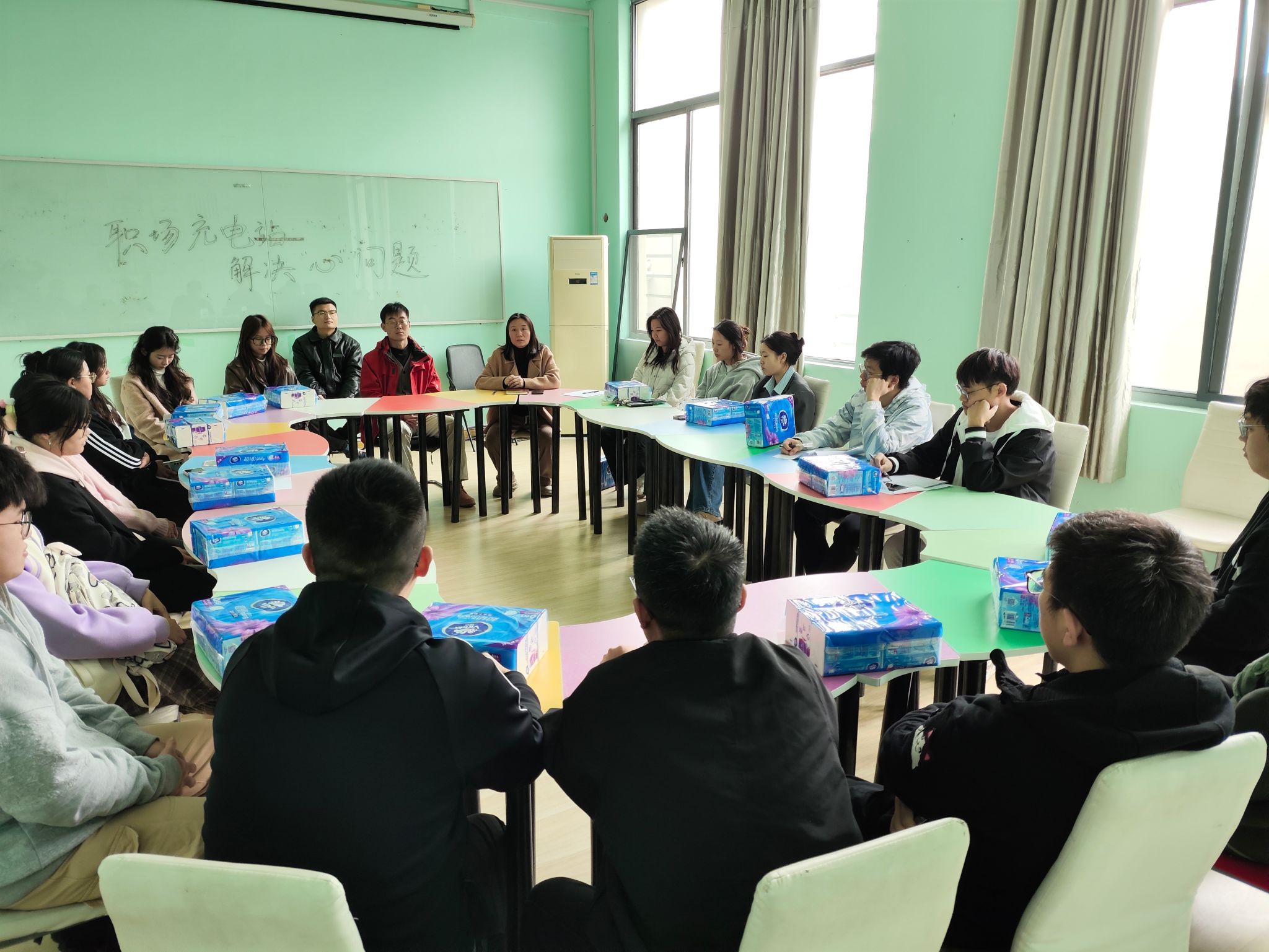 活动伊始,有趣的破冰环节点燃现场气氛,让同学们放下戒备,融入轻松氛围,拉近了彼此距离。团辅游戏让大家积极参与进来,有人分享考研心得,有人吐槽考公太卷,有人感叹求职太难,还有同学给大家献歌缓解紧张氛围,通过这些团辅活动为大家有效缓解了一定压力,打开了交流的大门。