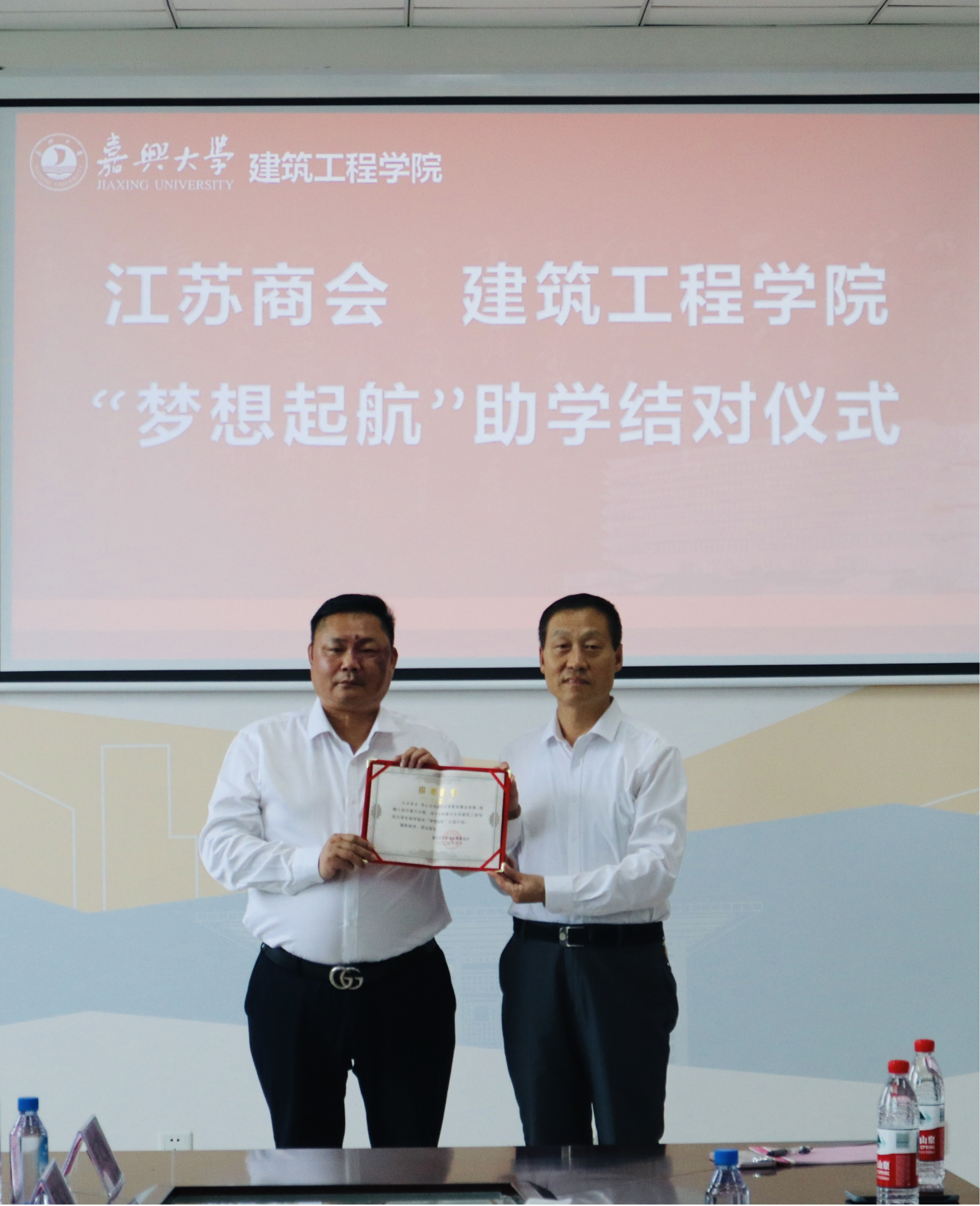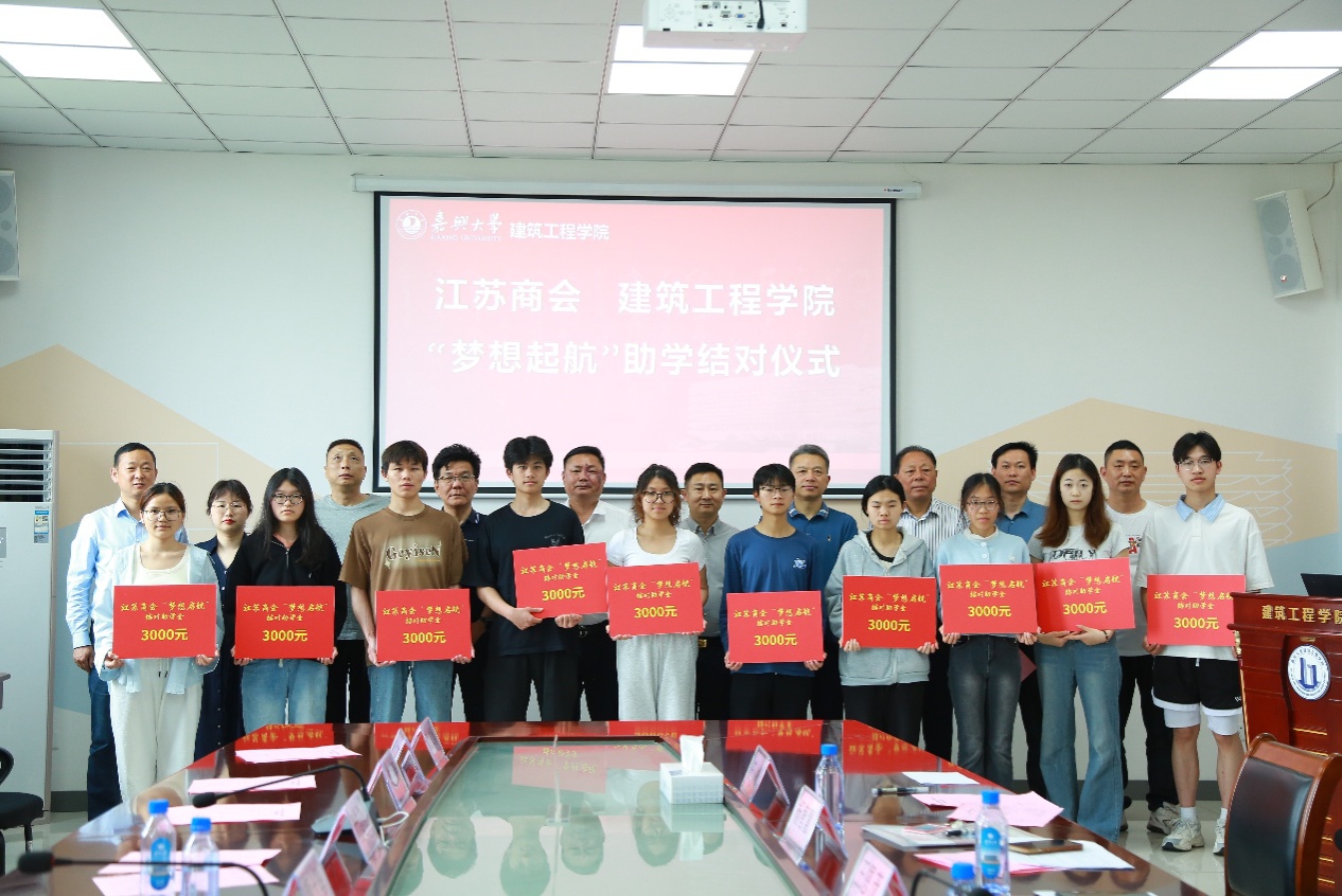 4月11日下午,春风和煦阳光明媚,嘉兴市江苏商会一行来到做爱视频 开展"梦想起航"公益计划爱心助学结对活动。嘉兴市江苏商会会长颜士华,商会党支部书记严志国,执行会长蔡勤生,常务副会长徐乃中、蔡多谋、程新华、谢文清、于广波,商会顾问施卫华,秘书长邱步国,秘书处梅叶娟爱心企业负责人代表和建筑工程学院院长王恩茂、党委书记童勇军、副书记杨智慧以及学院首批10名受助学生等出席本次活动。活动由童勇军主持