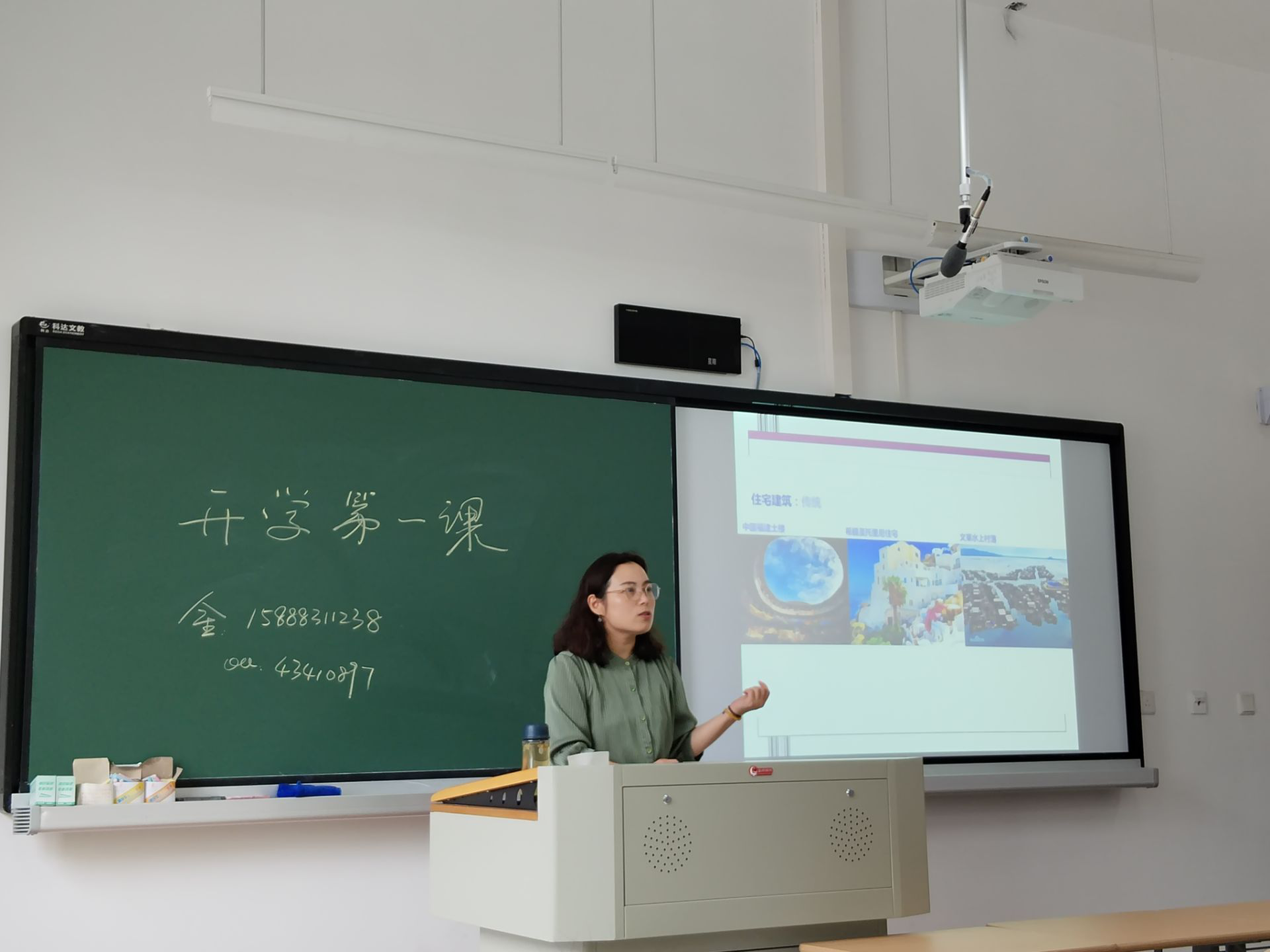 金老师就“建筑是什么?”“建筑学专业学什么?”、“建筑学专业怎么学?”等方面给新生进行问答式专业解疑。其利用暑期放假时间咨询了历届毕业生代表、优秀校友十余人对于本专业的感悟和理解,做成了视频和音频材料使新生有更直观更深层次的专业认知。学生课程参与度非常,课上掌声不断。